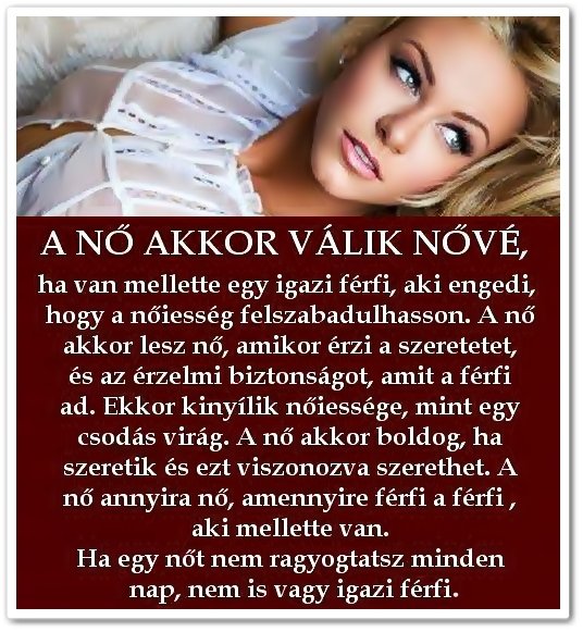 A NŐ akkor válik nővé, ha van mellette egy igazi férfi… Thomas042014-11-01Hozzászólások (0) Oldal ajánlása emailben X Címzett: Feladó: Üzenet: Ajánlott bejegyzések X Pasifogó tippek... - 2018-01-09 Ezek a férfiak erogén zónái a csillagjegyük alapján - 2018-01-07 5 jel, amiből biztosan rájössz, hogy szeret a párod! - 2018-01-07 Kövess minket a FACEBOOK-on is Címkék: férfi, gondolatok, nő Hasonló bejegyzések: A nő akkor válik nővé, ha van mellette egy igazi férfi… Egy igazi nő nem féltékeny, hanem féltő… Nem kételkedik… A FÉRFI a NŐ első szerelme… Mitől jó egy nő az ágyban a férfi szerint…